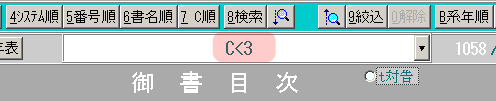 (1)まず、入力枠に「真蹟直読」と入力して「絞込」ボタンをクリックします。[真蹟直読]のある行が絞り込まれます。(*A)